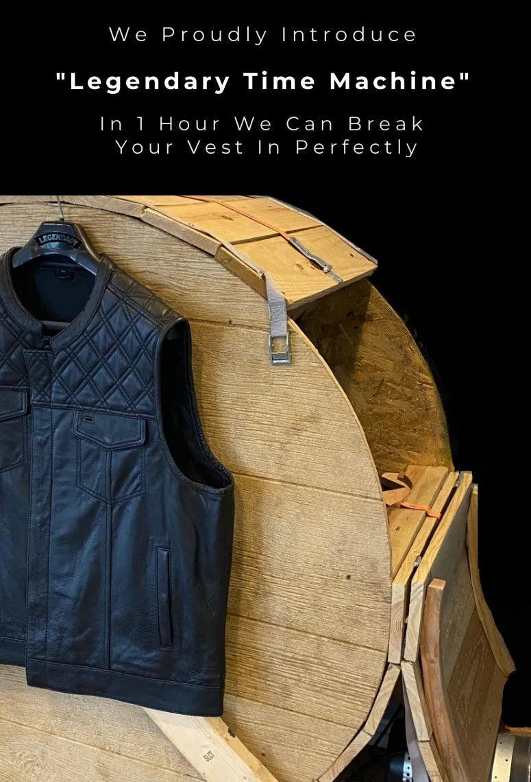 We have perfected our tumbling capability over the last 20 years and now offer it as an additional service when you purchase a vest. What started out as a science experiment, turned into a mission to develop a tumbling machine that could replicate years of wear in 1 hour of tumbling. We will never share the specifics of our machine, however we will say that we have the best damn vest breaking in service in the USA and most likely the only machine out there! Many customers looking to purchase a leather biker vest want their "cut" to have a broken in feel and aged look rather quickly. We have perfected our antiquing tumble method designed to further bring out the vintaged look in the leather. The end result is a motorcycle vest that has been well worn for about five years.