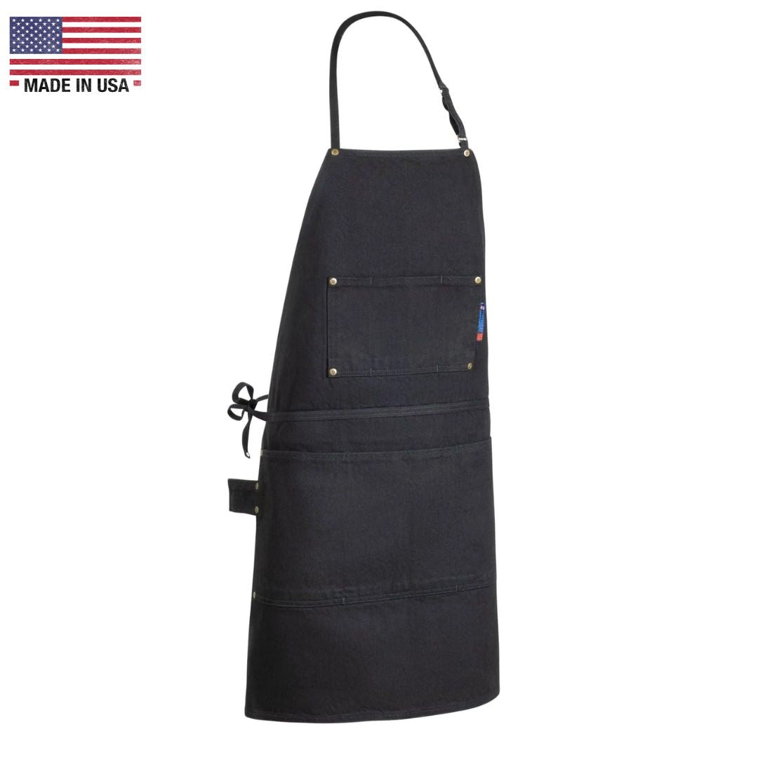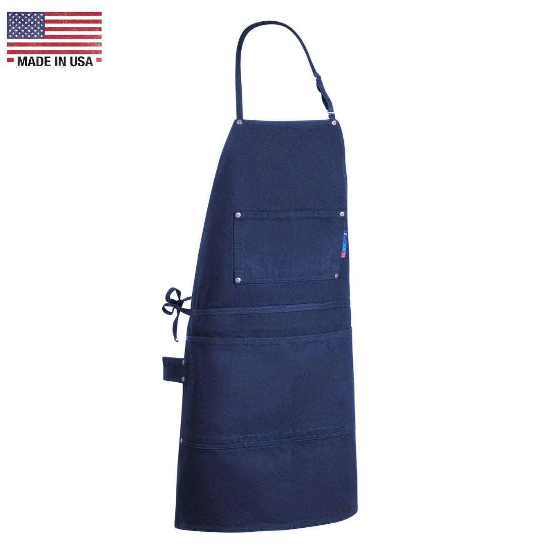 Looking for a heavy duty, men's denim apron that is made in the USA? Our Legendary Work Horse Apron is constructed of pre-rinsed heavy grade USA made denim, and is riveted at all the stress points for long wear. Features a total of six pouch pockets, reinforced hammer loop, adjustable neck loop and riveted denim ties. The Legendary heavy duty apron is a tough as nails option that's perfect for work, barbeque grill or the weekend warrior. In denim blue or black.