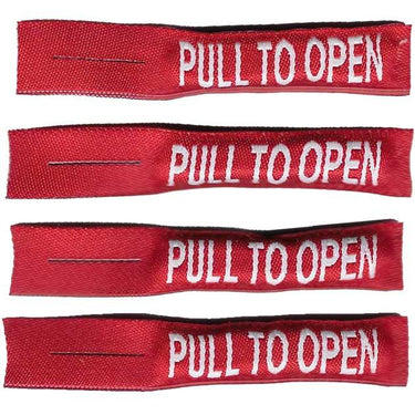 Military inspired padded red twill with white text reads "PULL TO OPEN" for installation on zipper slider. Use on jackets, vests, chaps, sleeping bags, etc. Dimensions: approx. 1.75" in length once installed. Pack of 4.