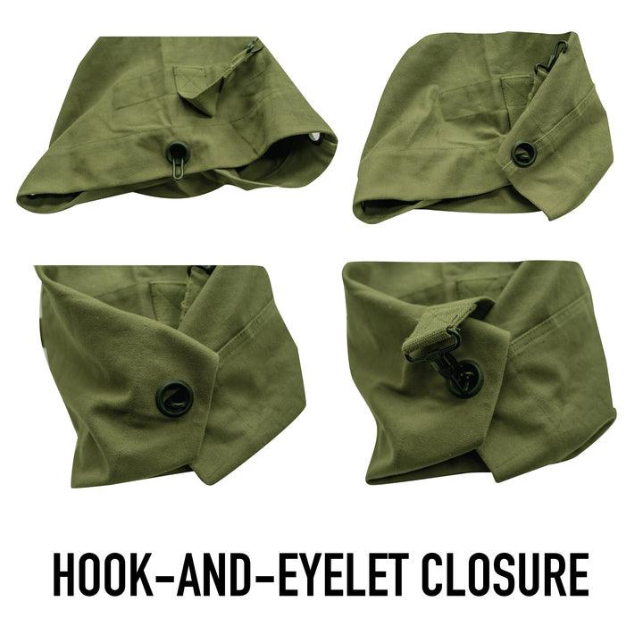 - RUGGED G.I. CANVAS DESIGN: Our Bags Feature A Top Loading Layout, Making It Easy To Store Large Amounts Of Clothing And Gear. Secure Your Items Inside With The Metal Clip Closure. There’s Also A Snap-Button Side Pocket For Quick Access To Small Items.