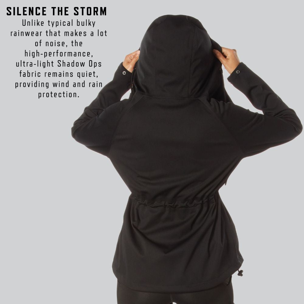 - Waterproof Design: Stay dry in any environment with our Womens Shadow Ops Waterproof Rain Jacket. Unlike the typical bulky rain coat that makes a lot of noise as you move, these high-performance, ultra-light rain jackets remain quiet, provide unparalleled wind and rain protection, and offer extreme comfort that weathers the storm. The outdoor jacket has a waterproof rating of 5,000mm.