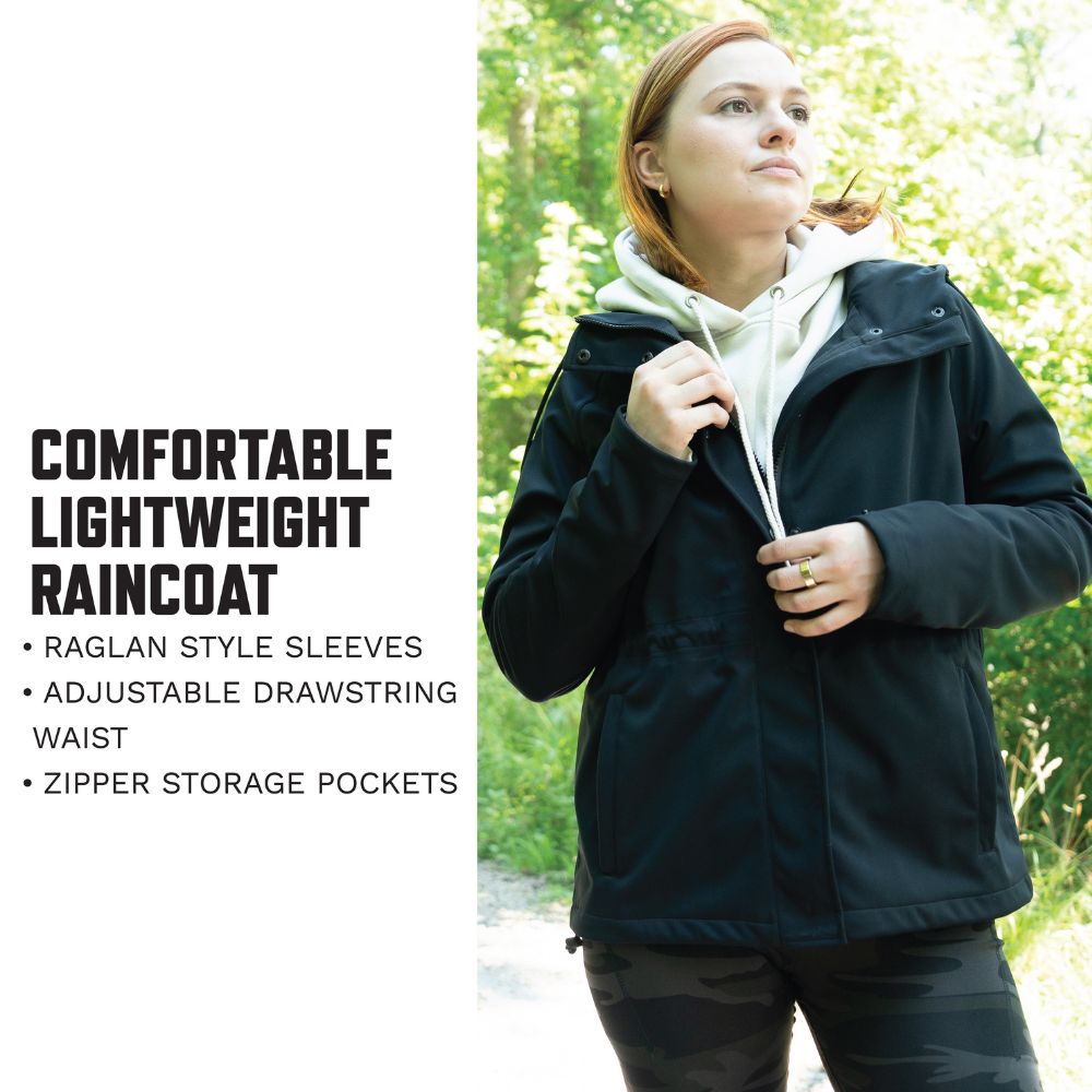 - All-Weather Protection: These womens raincoats come equipped with a drawstring hood, full-length zipper with a snap-button storm placket, zipper storm guard, adjustable hook & loop cuffs, and a drawstring bottom for keeping wind and rain out. The 2 zippered hand pockets and 2 interior drop pockets provide ample storage space for essentials.